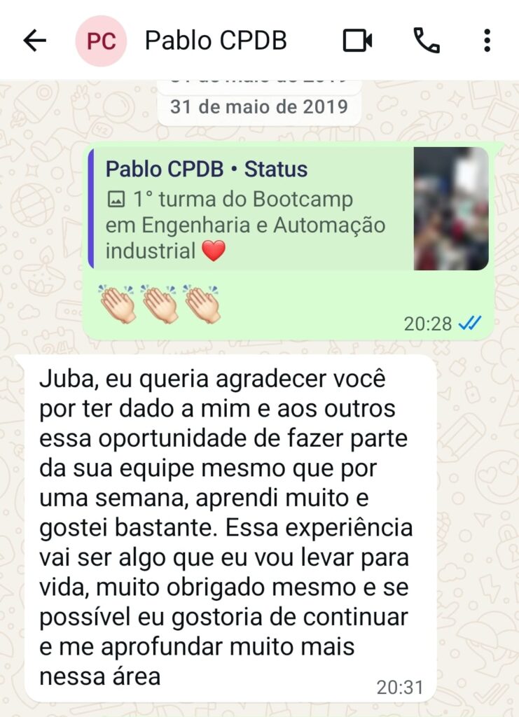 Eles me abriram as portas para que eu pudesse conversar diretamente com os alunos, apresentando o trabalho que fazíamos na empresa e compartilhando um pouco da nossa rotina de engenharia e automação industrial.