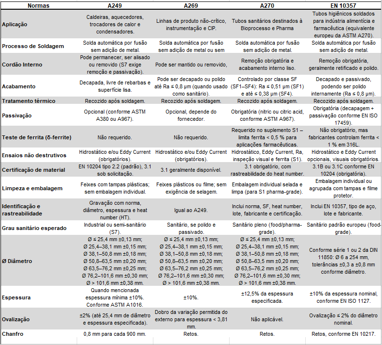 Tabela comparativa entre as principais normas de fabricação para tubos de Bioprocesso incluindo: ASTM A249, A269, A270 E EN 10357