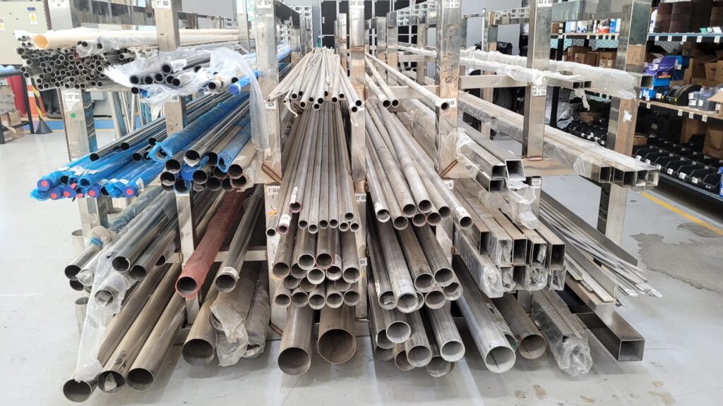 Estoque de tubos redondos, quadrados e perfis – EAI Engenharia e Aço Inox Ltda. – Hortolândia, SP